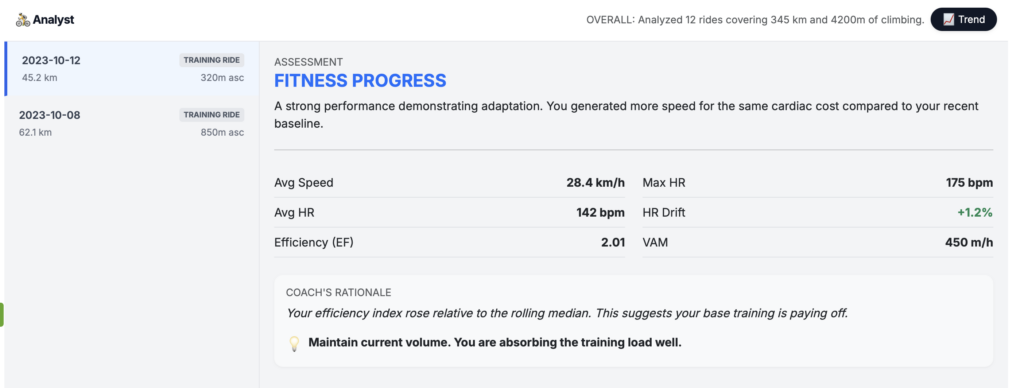 In our example, an EF of 2.01 with the coach noting that “efficiency index rose relative to the rolling median” signals genuine adaptation. The rider is producing more speed for the same cardiovascular effort compared to their recent baseline.