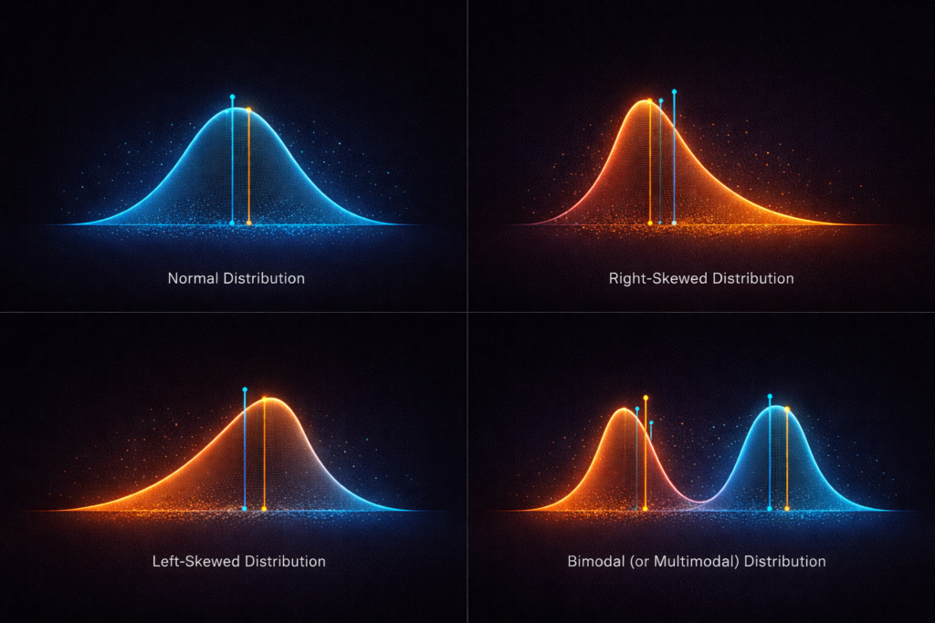 But real-world data is often not normally distributed. It’s skewed, multimodal, or heavy-tailed. And understanding which shape you’re dealing with is what determines whether the mean is a useful summary – or a dangerous one.